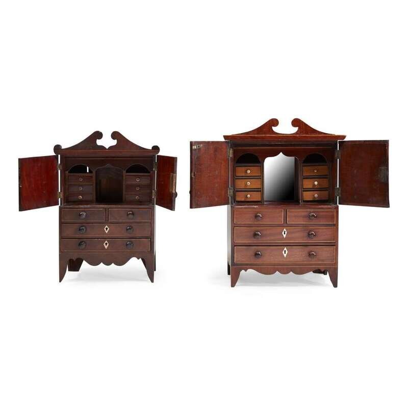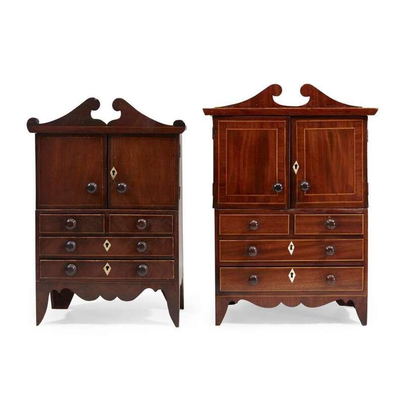 Two miniature inlaid mahogany linen presses England, 19th century