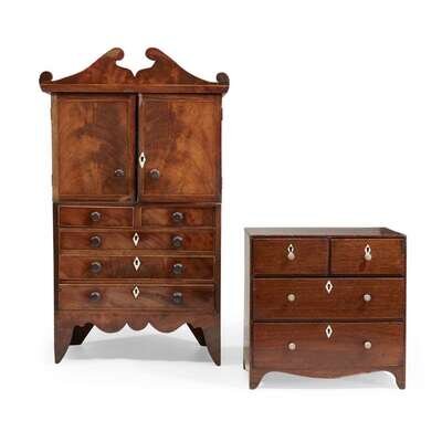 Miniature inlaid mahogany linen press and chest of drawers England, early 19th century