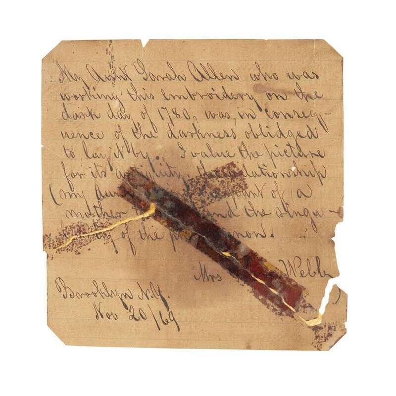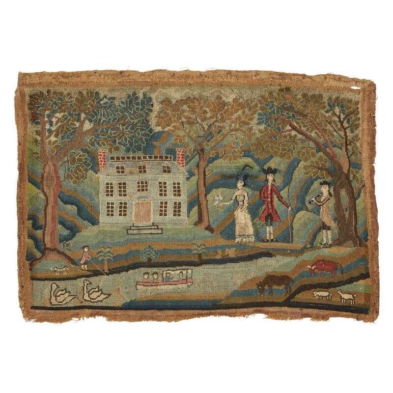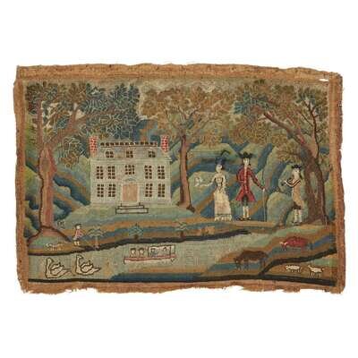 Courting scene with a large house similar to the Hancock House on Boston Common, worked in wool and silk on canvas, original backboard, accompanied by a hand-written note dated November 20, 1869, by Mrs. John Webb (1807-1876), Brooklyn, New York.