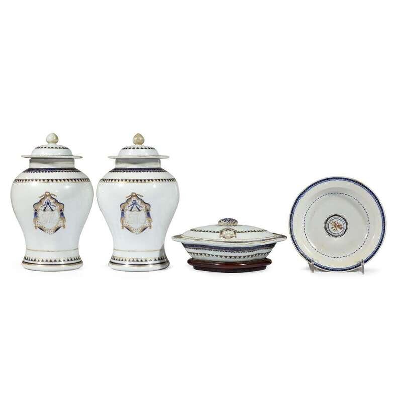 Comprising a pair of covered vases and a small tureen and cover, each bearing shield-shaped cartouches with monogram "JM"; and an associated round dish; all bearing cobalt enamel and gilt decoration.