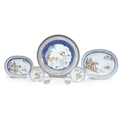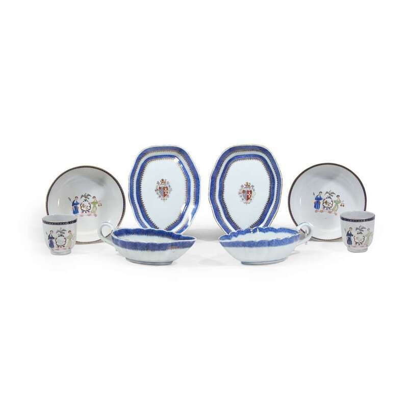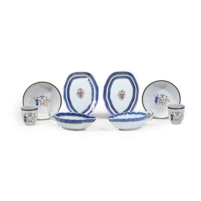 Including a large charger with reticulated edge decorated with a lady and two children, two graduated platters with reticulated edge decorated with fortress and ship, a pair of tea bowls and saucers, a pair of armorial sauce boats with leaf-shaped underplates, and a pair of teacups and saucers decorated with the Arms of New York. - .