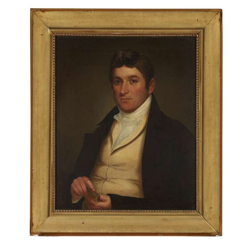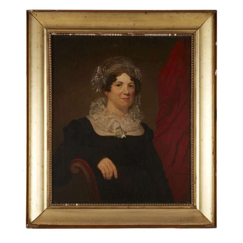 Both bearing old labels with provenance to portrait verso: "John Roland - brother of Henry Roland who was the grandfather of Horace Roland. This portrait was given to me by my aunt Aunt Julia F. (Roland) Hiester Oct. 1904. John Roland and Henry Roland married sisters - Catherine and Margeret Seeger - daughters of Frederic Seeger. John Roland and Catherine his wife are buried in Laurel Hill Cemetery, Phila. Catherine died aged 87. Her husband died much earlier", and equivalent label to verso of Catherine's portrait; oil on canvas, framed.