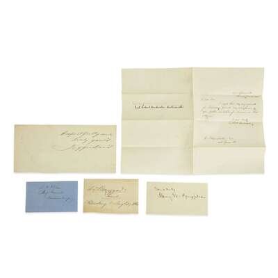 Including signed letter from Union General Robert Anderson (1805-1871) dated December 26, 1861, declining an invitation from Charles Macalester; a cut autograph from Confederate General Pierre G.T. Beauregard (1818-1893), dated 1864, Petersburg, Virginia; autograph of Confederate Cavalry General William Henry Fitzhugh Lee (1837-1891); autograph of Confederate Jefferson Davis(1808-1889) undated; together with an autograph of poet Henry Wadsworth Longfellow (1807-1882). .