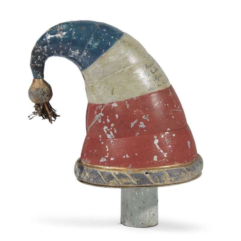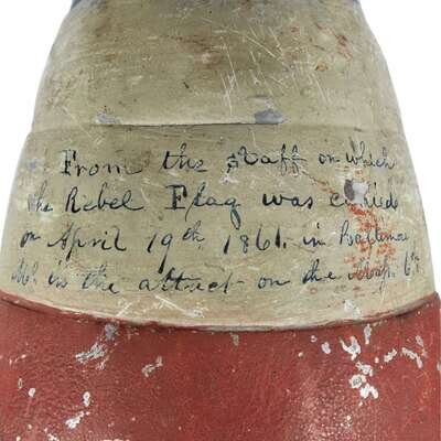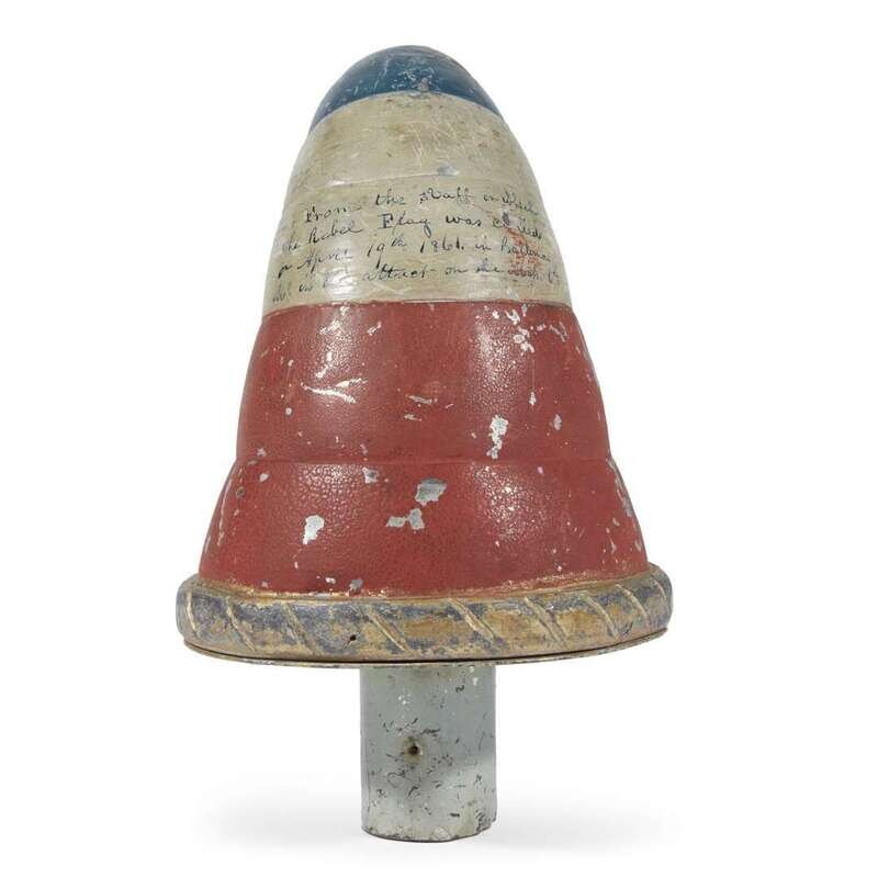 The cap, fitted on the underside with receptical for pole, inscribed by hand in ink, "From the staff of which the Rebel Flag was carried on April 19th 1861 in Baltimore Md. in the attack on the Mass 6th." This is the only "Liberty" or Phrygian Cap form parade pole finial known to exist.