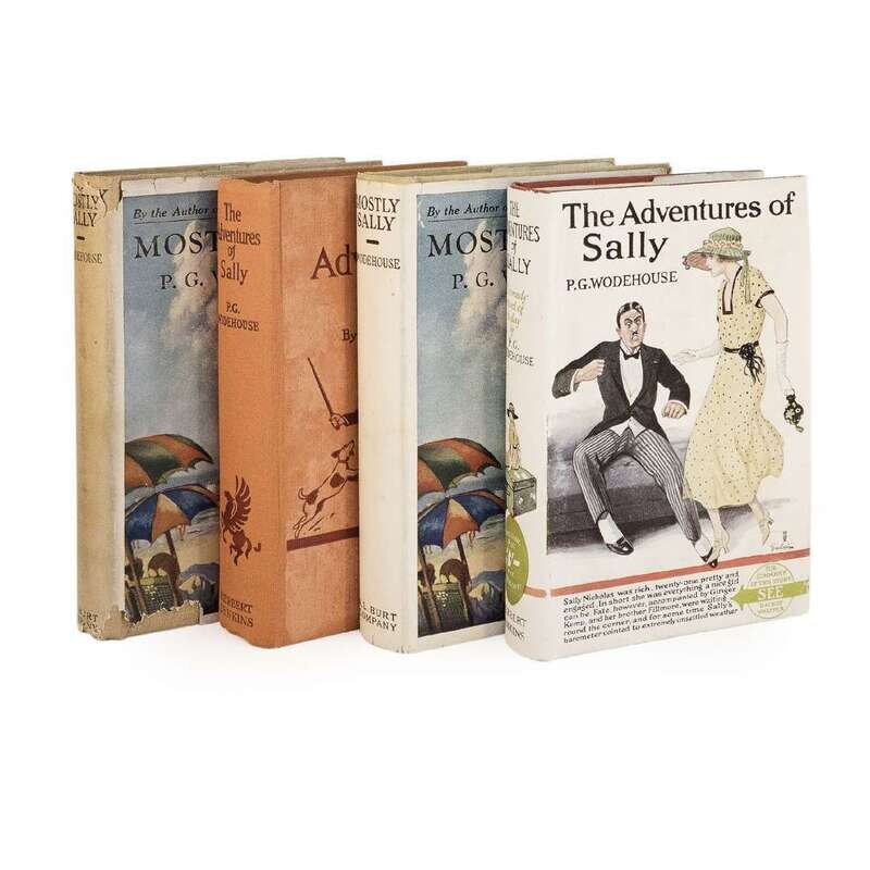 1. The Adventures of Sally London: Herbert Jenkins Limited, 1923. First edition, first issue. 8vo. 312, (8) (ads) pp. Original orange cloth-covered boards, boards faded, stamped in dark red; all edge trimmed; ownership signature on front free endpaper, scattered spotting; lacking dust-jacket. McIlvaine A29a. 2. The Adventures of Sally London: Herbert Jenkins Limited, no date. Reprint ("Tenth printing, completing 81,484 copies"). 8vo. 312, (8) pp. Original orange cloth-covered boards, stamped in black; in illustrated dust-jacket, tape repair to verso. Not in McIlvaine. 3. Mostly Sally New York: A.L. Burt Company, (1924). Second American reissue. 8vo. 317, (1), (2) (ads) pp. Original tan cloth-covered boards, stamped in blue; dust-jacket remnants on front and rear paste-down; in illustrated dust-jacket, chipping at spine and edges, tape repairs on verso. McIlvaine A29b3. 4. Mostly Sally New York: A.L. Burt Company, (1924). Second American reissue. 8vo. 317, (1), (2) (ads) pp. Original tan cloth-covered boards, stamped in blue; in illustrated dust-jacket, creasing and short closed tears to edges, tape repairs on verso. McIlvaine A29b3.
