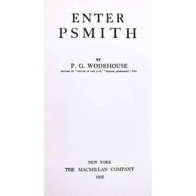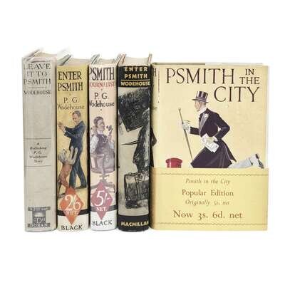 1. Leave it to Psmith New York: George H. Doran Company, (1924). FIrst American edition, first issue. 8vo. (x), 11-347, (3) pp. Original blue cloth-covered boards, stamped in dark blue; all edges trimmed; in original dust-jacket, variant with different ads on flaps, chipping to spine ends and corners, short closed tears to edges, lightly soiled, tape repairs to verso; book-plate of James H. Heineman on front paste-down. McIlvaine A31b. 2. Enter Psmith New York: The Macmillan Company, 1935. First American issue, variant not recorded in McIlvaine (with "Enter/Psmith" on title-page instead of "Enter Psmith", and with "Printed...by" on copyright, instead of "Published...at"). 8vo. (viii), 247, (1) pp. Original orange cloth-covered boards, soiling on front and rear boards, stamped in black; all edges trimmed; in original illustrated dust-jacket, light edge wear, lightly soiled, very light foxing to verso. See McIlvaine A12d. 3. Enter Psmith A. & C. Black, Ltd., (1935). First edition thus, first issue. 8vo. 247, (1) pp. Original printed A. & C. Black ad leaf laid in at front. Blue-green cloth-covered boards, spine ends browned, stamped in red; all edges trimmed; light offsetting to endpapers, short closed tear to fore-edge of pp. 79/80; in later issue illustrated dust-jacket (orange 2/6 net price label, but with six titles on rear panel; Phelps calls for a June and December 1935 reprint, presumably one of those), professionally restored, lightly soiled. McIlvaine A12c. 4. Psmith in the City A. & C. Black, Ltd., (1950). Fourteenth reprint. 8vo. iv, 266, (1) pp. Bright green cloth-covered boards, spine and edges lightly faded, stamped in red; in illustrated dust-jacket, lightly soiled and faded, tape repair to verso; original wrap around price band, spine and edges browned. McIlvaine A14a12. 5. Psmith Journalist London: A. & C. Black, Ltd., (1950). Second English edition, fourteenth reprint. 8vo. (viii), 247, (1) pp. Blue-green cloth-covered boards, spine soiled and faded, stamped in red; all edges trimmed; offsetting to endpapers, scattered spotting to text; in facsimile dust-jacket. McIlvaine A15c14.