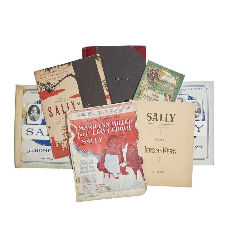 Locations vary, 1920-44. In seven pieces. Size and condition varies. Includes: 1. No place, 1921. Guy Bolton’s own typescript, labeled “Version of January, 1921” on title-page. Many emendations, presumably in Bolton’s hand. Bound in three-quarter red cloth over black pebbled cloth with Bolton’s name and “Sally” stamped in gilt on front board, “Sally/Act 1 2 & 3” stamped in gilt on spine. In a black fall-down-back box. 2. Look for the Silver Lining New York, 1920. 4to. Sheet music. Poor condition. 3. London and New York, 1921. 4to. Vocal score. (4), 132, (4) (ads) pp. Chappell & Co. Ltd. rubber stamp on title-page. Price 8/- net. Photographic wrappers. 4. London and New York, 1921. 4to. Vocal score. (4), 132, (4) (ads) pp. Chappell & Co. Ltd. rubber stamp on title-page. Price 8/- net. Photographic wrappers. Worn, old crude spine repair. (another copy) 5. London and New York, (1921 but appears much later). 4to. Vocal score. (4), 132, pp. Price 12/6 net. Printed wrappers. 6. New York, April 3, 1922. Program from the original production, at the New Amsterdam Theatre. 7. Program from The Los Angeles Civic Light Opera Association’s 1944 production. Heavily inscribed to cast member Leonne Hall by the cast and crew.