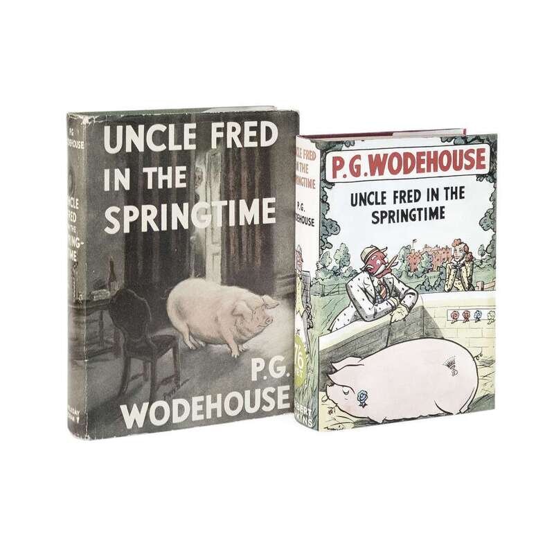New York: Doubleday, Doran & Co., Inc., 1939. First edition, first issue. 8vo. (viii), 292, (4) pp. Original green cloth-covered boards, slightly cocked, stamped in brown; top edge stained green, other edges trimmed; offsetting to endpapers; in original illustrated dust-jacket, light edgewear, small closed tears and chipping at spine ends, rear panel lightly soiled. McIlvaine A61a. Together with: Uncle Fred in the Springtime London: Herbert Jenkins Limited, (1939). First English edition, first issue. 8vo. 311, (5) pp. Original dark red cloth-covered boards, faint stain on front board, stamped in blind and in gilt; top edge stained red, other edges trimmed; offsetting to endpapers, faint stain at corner of p. 95; in original illustrated dust-jacket, restored along panel edges, portion of lettering filled in on spine. McIlvaine A61b.