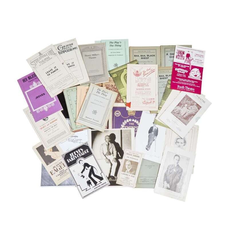 Locations vary, 1911-85. In 35 pieces. Size and condition varies. Includes: 1. Wodehouse, P.G. and Ian Hay Baa, Baa, Black Sheep London and New York, 1930. Text of play. 2. Wodehouse, P.G. and Ian Hay Baa, Baa, Black Sheep London and New York, 1930. Text of play. (another copy). 3. Wodehouse, P.G. and Ian Hay Baa, Baa, Black Sheep London and New York, 1930. Text of play. Book-plate on verso of front wrapper. (another copy). 4. Wodehouse, P.G. and Ian Hay Baa, Baa, Black Sheep London, 1929. Program for production at the New Theatre. 5. Wodehouse, P.G., and Jerome Kern, and George Grossmith The Beauty Prize (London, 1923). Vocal score. 6. Wodehouse, P.G. Candle-Light New York, etc., (1934). Text of play. Adapted from Siegfried Geyer’s Kleine Komödie (1927). 7. Wodehouse, P.G. Candle-Light New York, etc., (1934). Text of play. Adapted from Siegfried Geyer’s Kleine Komödie (1927). Scattered marginalia in pencil. (another copy). 8. Wodehouse, P.G., and Ian Hay A Damsel in Distress London and New York, (1930). Text of play. “Made in England” rubber-stamped on title-page. 9. Wodehouse, P.G., and Ian Hay A Damsel in Distress London and New York, (1930). Text of play. (another copy, front wrapper very slightly different). 10. Wodehouse, P.G., and Ian Hay A Damsel in Distress London and New York, (1930). Text of play. Scattered marginalia in pencil. Book-plate on verso of front wrapper. (another copy, front wrapper very slightly different from both copies above). 11. Wodehouse, P.G., and John Stapleton A Gentleman of Leisure No place, no date (ca. 1911). Advertising card. Author and Wodehouse collector David A. Jasen’s copy which can be seen in his book, The Theatre of P. G. Wodehouse (1979), page 20. 12. Wodehouse, P.G. Good Morning, Bill! (London), 1927. Program from opening night, at the Duke of York’s Theatre, November 28, 1927. 13. Wodehouse, P.G. Good Morning, Bill! (London, 1927). Program from the Duke of York’s Theatre, printed December 14, 1927. 14. Wodehouse, P.G. Good Morning, Bill! London, April 16, (1934). Program from the Saville Theatre. The literature tells us that the revival of Good Morning, Bill! opened at the Daly Theatre on March 20, 1934. The existence of this program, dated on weeks later casts doubt on that notion. 15. Marischka, Ernst, and Bruno Granichstadten Hearts and Diamonds London, 1926. Program for its only production, at the Strand Theatre. It ran for only 46 performances. Adapted into English by Wodehouse and Laurie Wylie. 16. [Deval, Jacques], Wodehouse, P.G., and Valerie Wyngate (adaptation) Her Cardboard Lover Newark, March, 1927. Brochure for a production at the Broad Street Theatre, in New Jersey, which opened on March 14th then ran for one week before moving to Broadway, opening at the Empire Theatre on March 21, 1927 and running for 152 performances. 17. [Deval, Jacques], Wodehouse, P.G., and Valerie Wyngate (adaptation) Her Cardboard Lover London, no date (ca. 1928). Program from the London production which opened on August, 21, 1928 at the Lyric Theatre. 18. Wodehouse, P.G. The Inside Stand London, December 23, 1935. Program from the Saville Theatre. 19. Ayckbourn, Alan, and Andrew Lloyd Webber Jeeves No place, (1975). Program for a production at Her Majesty’s Theatre. 20. Wodehouse, P.G. Jeeves Takes Charge Washington, D.C., (1984). Advertisement for the production at the Ford’s Theatre. 21. Wodehouse, P.G. Jeeves Takes Charge London, September 30, 1980. Opening night program for the production at the Fortune Theatre. Signed by E.S. Cazalet, Wodehouse’s step-grandson, whose appreciation of Wodehouse is printed here. 22. Wodehouse, P.G. Joy in the Morning No place, no date. Photocopied typescript for possibly the only production of this play. Approximately 83 pp. (some misnumbered, some repeated, not collated). Roderick Easdale, in The Novel Life of PG Wodehouse (2004), wrote “…the script of…Joy in the Morning…was originally called Phipps and is the play from which [the novel] The Old Reliable (1951) was written, and has no connection with the…novel of the same name…” With licence stamp on cover from the Lord Chamberlain’s Office, dated 1954, for the amateur theater group, The Buckfast Players to be performed at their Studio Theatre in Ashburton in Devon. 23. Wodehouse, P.G., and Ian Hay Leave it to Psmith London, September 15, 1930. Program for the production at the Golders Green Hippodrome, preceding the West End production at the Shaftesbury Theatre, which opened on September 27. 24. Wodehouse, P.G., and Ian Hay Leave it to Psmith London, September 22, 1930. Program for the production at the Streatham Hill Theatre, preceding the West End production at the Shaftesbury Theatre, which opened on September 27. 25. Wodehouse, P.G., and Ian Hay Leave it to Psmith London, December 8, 1930. Program for the production at the Shaftesbury Theatre, which opened on September 27. 26. Wodehouse, P.G., and Ian Hay Leave it to Psmith London and New York, 1932. First English edition in wrappers. Text of play. Signed by multiple members of the cast of an unknown production of the play. McIlvaine C6a. 27. Wodehouse, P.G., and C.H. Bovill Nuts and Wine London, 1914. Program for its only production, at The Empire Theatre. It ran for only seven performances. 28. [Molnar, Ferenc] Wodehouse, P.G. (adaptation) The Play’s the Thing New York: November 15, 1926. Program from the first production, at Henry Miller’s Theatre, which opened on November 3, 1926. 29. [Molnar, Ferenc] Wodehouse, P.G. (adaptation) The Play’s the Thing New York: Brentano’s, (1927). Text of play. In dust-jacket. 30. [Molnar, Ferenc] Wodehouse, P.G. (adaptation) The Play’s the Thing New York, etc., (ca. 1953). Text of play. 31. [Molnar, Ferenc] Wodehouse, P.G. (adaptation) The Play’s the Thing New York, etc., no date (modern, includes an ISBN number). Text of play. Staple bound. (another copy). 32. [Molnar, Ferenc] Wodehouse, P.G. (adaptation) The Play’s the 