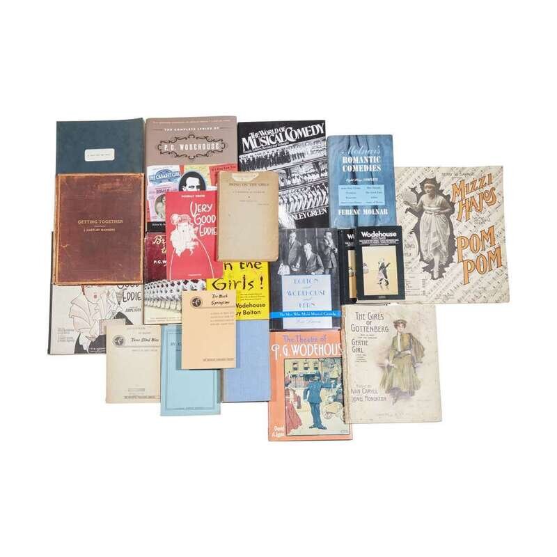 Locations vary, 1907-2004. In 23 pieces. Size and condition varies. Includes: 1. Adler, Marjorie Duhan Too Much Springtime: A Comedy in Three Acts Chicago, (1955). Printed play. Based on Wodehouse’s novel, The Mating Season. 2. Bolton, Guy A Man and His Wife No place, no date (ca. 1970). Typescript for play with relevant ephemera laid in. No known connection to Wodehouse. 3. Bolton, Guy Three Blind Mice Chicago, (1958). Printed play. Wodehouse borrowed the plot from this play for his novel, French Leave. 4. Bolton, Guy, et al. Very Good Eddie New York, 1916. Vocal score for the play that drew Bolton, Wodehouse and Jerome Kern together. They would ultimately collaborate on nine shows together. 5. Bolton, Guy, et al. Very Good Eddie London, 1976. Theater program for revival. 6. Caldwell, Anne, and Hugo Felix Pom Pom New York, 1916. Four individual pieces of sheet music for the songs Evelyn (two copies), Pom Pom, and In the Dark. Wodehouse is rumored to have been called in to “doctor” the show but no proof exists. 7. Caryll, Ivan, and Lionel Monckton The Girls of Gottenberg London, etc. 1907. Vocal score. Wodehouse wrote the song “Our Little Way” which may have been in the show. Caryll would later work with him, writing the music for The Girl Behind the Gun (1918) (UK title, Kissing Time, [1919]) and The Canary (1918). 8. Davis, Lee Bolton and Wodehouse and Kern: The Men Who Made Musical Comedy New York, (1993). First edition. 9. Day, Barry (editor) The Complete Lyrics of P. G. Wodehouse Lanham, Maryland, etc., 2004. First edition. 10. Graham, Harry By Candle Light London, no date (1950s). Printed play. Adapted from Siegfried Geyer’s Kleine Komödie (1927). In 1930 Wodehouse also adapted Geyer’s play, as Candle-light. 11. Green, Stanley The World of Musical Comedy: The Story of the American Musical Stage as Told Through the Careers of its Foremost Composers and Lyricists. Fourth Edition, Revised and Enlarged (New York, no date). Not in McIlvaine 12. Hay, Ian, and J. Hartley Manners, et al. Getting Together New York, 1918. Co-writer, J. Hartley Manners’ copy of a bound typescript with emendations in an unknown hand. Pages from the published program as well as several original 8 x 10 prints of the production bound in. Hay later worked with Wodehouse on the dramatizations of A Damsel in Distress (1928), Baa, Baa, Black Sheep (1929), and Leave it to Psmith (1930). 13. Jasen, David A. The Theatre of P. G. Wodehouse London, (1979). First edition. McIlvaine H28 14. Molnar, Ferenc Romantic Comedies, Eight Plays by Ferenc Molnar New York, (1952). Includes two plays with English texts by Wodehouse. Not in McIlvaine 15. Trewin, J.C. (editor) Plays of the Year, 1948-49 London, (1949). First edition. Includes Don’t Listen, Ladies! by Wodehouse (as Stephen Powys) and Guy Bolton. Dust-jacket wanting. Not in McIlvaine 16. Wodehouse, P.G. Four Plays London, (1983). First edition. Black cloth. McIlvaine B27 17. Wodehouse, P.G. Four Plays London, (1983). First edition. Wrappers. McIlvaine B27 18. Wodehouse, P.G., and Guy Bolton Bring on the Girls! The Improbable Story of Our Life in Musical Comedy, with Pictures to Prove it New York, 1953. First edition. McIlvaine A75a 19. Wodehouse, P.G., and Guy Bolton Bring on the Girls London, no date. Unrevised proof copy of first edition, printed date on cover: February 19th, 1954. Note no subtitle used. McIlvaine A75b 20. Wodehouse, P.G., and Guy Bolton Bring on the Girls: The Improbable Story of Our Life in Musical Comedy, with Pictures to Prove it London, (1954). First English edition. McIlvaine A75b.