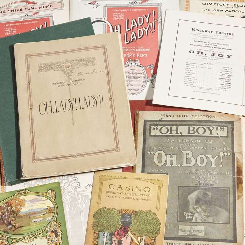 Locations vary, 1917-. In 12 pieces. Size and condition varies. Includes: 1. Oh, Boy! New York and London, (1917). 4to. Sheet music (Pianoforte Selection). Photographic limp wrappers, repaired. 2. Till the Clouds Roll By New York, (1917). 4to. Sheet music. From Oh, Boy! Illustrated limp wrappers, spine split. 3. An Old-fashioned Wife New York, (1917). 4to. Sheet music. From Oh, Boy! Illustrated limp wrappers. Previous owner’s signature on front wrapper. 4. Oh, Boy! New York, January 28, 1918. Program from the production at the Casino theatre. Oh, Boy! was first produced at the Princess Theatre, February 20, 1917. 5. Oh, Joy! London, January 27, 1919. Program from opening night of the West End production at the Kingsway Theatre. Oh, Boy! was retitled Oh, Joy! when it was brought to London. 6. Leave it to Jane Photocopy of script, date unknown. 7. The Riviera Girl New York, September 24, 1917. Program from opening week of the original production, at the New Amsterdam Theatre. 8. Oh, Lady! Lady!! New York, 1918. 4to. Score. (6), 90 pp. Shaken. In a green fall-down-back box. 9. When the Ships Come Home New York, (1918). 4to. Sheet music. From Oh, Lady! Lady!! Illustrated limp wrappers. 10. When the Ships Come Home New York, (1918). 4to. Sheet music. From Oh, Lady! Lady!! Illustrated limp wrappers, spine split. (another copy). 11. Sitting Pretty New York, April 8, 1924. Program from opening week of the original production, at the Fulton Theatre. 12. Sitting Pretty New York, April 14, 1924. Program from the second week of the original production, at the Fulton Theatre. (another copy).