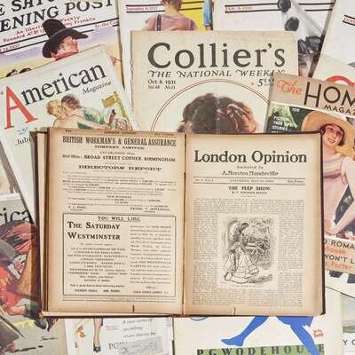 Locations vary, 1904-1950. In 22 volumes. Size and condition varies. Includes: 1. The American Magazine. July, 1931. Featuring: "If I Were You." McIlvaine D4.4. 2.The American Magazine. October, 1931. Featuring: "The Smile that Wins," and "What His Daughter Thinks About P.G. Wodehouse" by Leonora Wodehouse. McIlvaine D4.5. 3. The American Magazine. February, 1932. Featuring: "The Bishop's Cat (The Story of Webster)." McIlvaine D4.8. 4. New York: Collier's. Vol. 68, no. 15, October 8, 1921. Featuring: "The Adventures of Sally." McIlvaine D15.28. 5. New York: Collier's. Vol. 86, no. 17, October 25, 1930. Featuring: "Big Money." McIlvaine D15.58. 6. New York: Collier's. Vol. 89, no. 21, May 21, 1932. Featuring: "Hot Water." McIlvaine D15.70. 7.New York: Collier's. Vol. 89, no. 23, June 4, 1932. Featuring: "Hot Water." McIlvaine D15.72. 8. New York: Collier's. Vol. 89, no. 21, May 21, 1932. Featuring: "Hot Water." McIlvaine D15.70. 9. New York: Collier's. Vol. 126, no. 2, July 8, 1950. Featuring: "Phipps to the Rescue." McIlvaine D15.84. 10. The Home Magazine. August, 1931. Featuring: "A Dog-Eared Romance." McIlvaine D31.1. 11. New York: Liberty. November, 1947. Featuring: "Full Moon." McIlvaine D36.55. 12. Mandeville, A. Moreton. London Opinion. Vol. 1, March 24, 1904-June 25, 1904. Featuring: "At the Play." Inscribed by the editor on front free endpaper. McIlvaine D108.1. 13. Philadelphia: The Saturday Evening Post. January 8, 1916. Vol. 188, no. 28. Featuring: "Uneasy Money" McIlvaine D59.16. 14. Philadelphia: The Saturday Evening Post. January 15, 1916. Vol. 188, no. 29. Featuring: "Uneasy Money" McIlvaine D59.17. 15. Philadelphia: The Saturday Evening Post. In eight volumes. July 24, 1937-September 11, 1937. Vol. 210, no. 4-11. Featuring: the complete serialization of "Summer Moonshine" McIlvaine D59.101-108. 16. London: Tit Bits. June 11, 1910. Featuring: "The Intrusion of Jimmy." Not in McIlvaine.