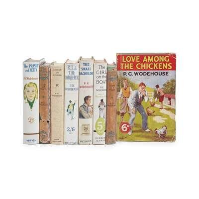 Locations vary, 1932-1938. In eight volumes. Condition varies. Includes: 1. Louder and Funnier London: Faber & Faber, (1932). Presumed fourth reissue, with "First published in mcmxxxii" on copyright page, and without "Second edition September 1932" statement. Original peacock-blue cloth-covered boards, stamped in gilt; in original plain tan dust-jacket. McIlvaine A45a5. 2. Love Among the Chickens London: George Newnes, Limited, no date (ca. 1932). 14th reissue. 8vo. 128 pp. One of the “Popular ‘Sixpennies’”. Illustrated stiff wrappers, a bit worn, creased and with several short closed tears; text unevenly browned and with scattered foxing to prelims. McIlvaine A7c15. 3. Louder and Funnier London: Faber & Faber, (1933). Sixth reissue, Faber Library #18. 8vo. Original green cloth-covered boards, stamped in gilt; in original red dust-jacket. McIlvaine A45a7. 4. Another copy of the above. McIlvaine A45a7. 5. The Small Bachelor London: Methuen & Co. Ltd., (1934). Ninth edition. 8vo. Original green cloth-covered boards, stamped in black; in original illustrated dust-jacket. McIlvaine A37a11. 6. The Prince and Betty London: George Newnes, Limited, no date (1935). Eighth reissue. 8vo. Original blue cloth-covered boards, stamped in black; in original illustrated dust-jacket. McIlvaine A15b9. 7. Bill the Conqueror London: Methuen & Co. Ltd., (1938). Sixteenth edition. 8vo. Original orange cloth-covered boards, stamped in black; in original illustrated dust-jacket. McIlvaine A33a16. 8. The Girl on the Boat London: Herbert Jenkins Limited, no date (ca. 1930s). Fourteenth printing, completing 108, 781 copies. 8vo. Original orange cloth-covered boards, stamped in black; in original illustrated dust-jacket. Not in McIlvaine.