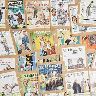 (London): Herbert Jenkins, dates vary (ca. 1930s-50s). 83 original dust-jacket sample sheets, comprising front and spine panel designs; primarily reissue with 5 net price labels, unless otherwise noted. Each approximately 7 1/2 x 6 1/2 in. (19 x 16.5cm), and mounted onto 9 x 8 in. (22.8 x 20.3cm) sheets; in folder and blue cloth-covered fall-down-back box. Condition varies. Includes: 1. Big Money 2. Blandings Castle (2) 3. Carry on, Jeeves! 4. The Coming of Bill 5. The Adventures of Sally (2) 6. The Clicking of Cuthbert (2) 7. The Code of the Woosters (2) 8. A Damsel in Distress (3) 9. Eggs, Beans and Crumpets (2, one with 7/6 net price label) 10. Full Moon (2, one with no price label) 11. A Gentleman of Leisure (2) 12. The Girl on the Boat (3) 13. Heavy Weather (no price label) 14. Hot Water (3) 15. If I Were You (2) 16. Indiscretions of Archie (2) 17. The Inimitable Jeeves (4 net price label) 18. Jill the Reckless (2, one 4 net price label) 19. Joy in the Morning (2, one with no price label) 20. Laughing Gas 21. Leave it to Psmith (2) 22. Lord Emsworth and Others (3) 23. Love Among the Chickens (2) 24. The Luck of the Bodkins (2) 25. The Mating Season (2, no price labels) 26. Meet Mr. Mulliner (3, one with 4 net price labels) 27. Money for Nothing (2) 28. Money in the Bank (2, no price labels) 29. Mr. Mulliner Speaking (2) 30. Mulliner Nights (2, each with 4 net price label) 31. Nothing Serious (no price label) 32. Piccadilly Jim (2) 33. Quick Service (3, one with 7/6 net price label) 34. Right Ho, Jeeves 35. Summer Lightning (2) 36. Summer Moonshine (3) 37. Spring Fever (2, one with no price label) 38. Thank You, Jeeves 39. Travellers Joy. Jowett, John. (No price label) 40. Ukridge (2) 41. Uncle Dynamite (2, no price labels) 42. Uncle Fred in the Springtime (2) 43. Very Good, Jeeves 44. Young Men in Spats.