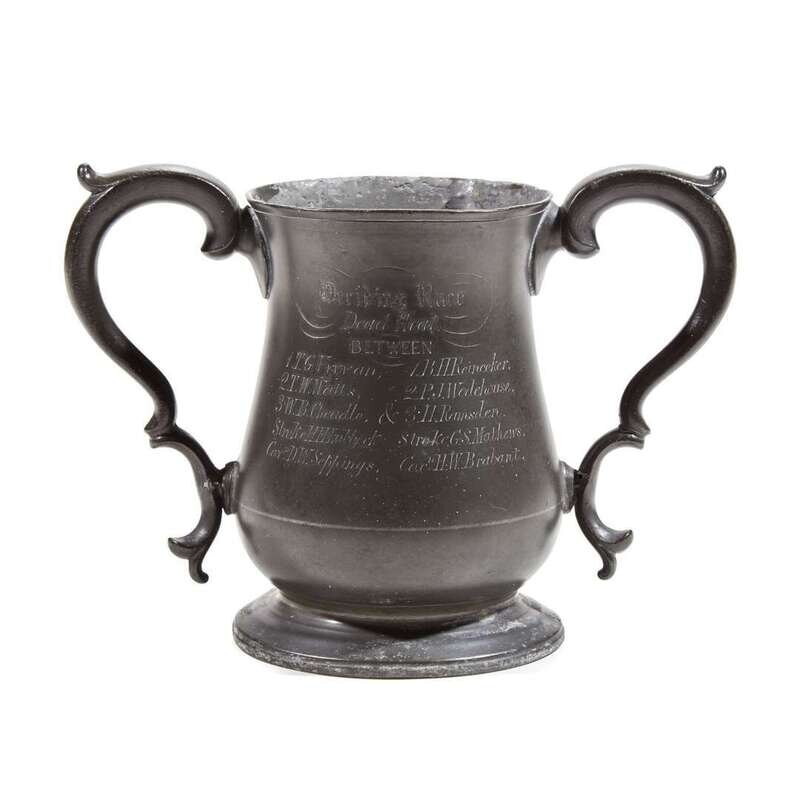 Victorian pewter loving cup rowing trophy with glass bottom, engraved on the obverse: “Caius Coll : Scratch Fours./March 12, 1857/(school crest)/5 Boats Started", and on the reverse: "Deciding Race/Dead Heat./Between (list of eight participants including P.J. Wodehouse in the 2nd seat of one of the boats).” Approximately 6 3/4 in. tall.
