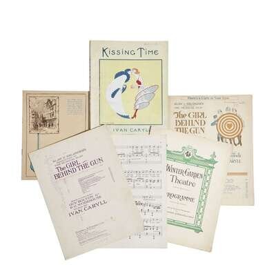 Locations vary, 1918-19. In five pieces. Size and condition varies. Includes: 1. Some Day Waiting Will End New York, etc., 1918. 4to. Sheet music from The Girl Behind the Gun, the original and American production of what became Kissing Time when transferred to the West End. Printed limp wrappers. 2. There’s a Light in Your Eyes New York, etc., 1918. 4to. Sheet music from The Girl Behind the Gun, the original and American production of what became Kissing Time when transferred to the West End. Illustrated limp wrappers, split; contemporary owner’s signature on front wrapper. 3. Kissing Time London, etc., no date (1919). 4to. (4), 147, (1) (ads) pp. Vocal score. Stiff printed wrappers, bottom two inches of spine perished; signature of Ivan Caryll rubber-stamped on title-page. In a green fall-down-back box. 4. Kissing Time London, May 20, 1919. Program from the original 1919 production at the Winter Garden Theatre which was also the first production put on at that theatre. 5. Hibbert, Henry George The Growth of a Great Enterprise: An Impression of Grossmith and Laurillard London, May 20, 1919. Different program than above but also related to the opening of both the theatre as well as Kissing Time.