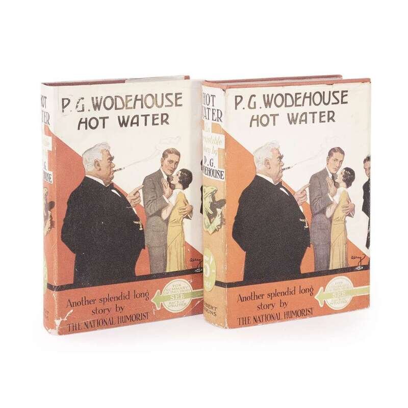 London: Herbert Jenkins Limited, (1932). First edition, first issue. 8vo. 312, (8) (ads) pp. Inscribed by Wodehouse to his bibliographer and biographer David A. Jasen on front free endpaper: "To/David/from/Plum/P.G. Wodehouse." Original orange cloth-covered boards, slightly cocked, spine lightly sunned, stamped in black; all edges trimmed; in second reissue (sixth printing) dust-jacket (McIlvaine A47a3), repaired at spine, edges worn, spine faded. McIlvaine A47a. Together with: Hot Water London: Herbert Jenkins Limited, no date. Reprint ("Second printing, completing 40,000 copies"). 8vo. 312, (8) (ads) pp. Original orange cloth-covered boards; all edges trimmed; in advance review copy dust-jacket (with green 2/6 net label on spine and "Hot Water" listed at 7/6 net on front flap, see note in McIlvaine A47a), restored and moderately worn. Not listed in McIlvaine.