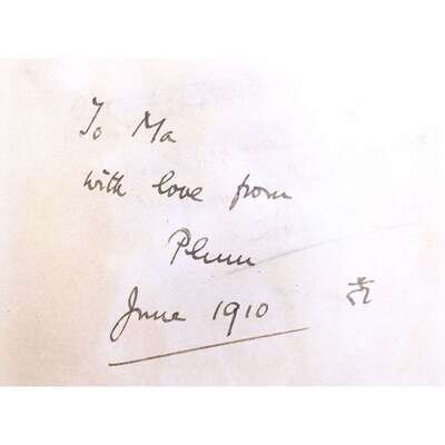 New York: W.J. Watt & Company, (1910). First edition, first issue. 8vo. (vi), 314 pp. Inscribed by Wodehouse to his mother, one month after publication, on front free endpaper: "To Ma/with love from/Plum/June 1910," with a small drawing of a stick figure by him next to date. Illustrated with frontispiece and four plates. Original pictorial black cloth-covered boards, rubbed, spine faded, stamped in gilt, in blind, olive-green, yellow, with round illustrated paper onlay on front board; all edges trimmed; bottom portion of front free endaper excised, with remnants of erased Wodehouse signature and inscription on remaining upper portion, scattered spotting to text, printer's error on p. 282; in black cloth-covered fall-down-back box. McIlvaine A13a.