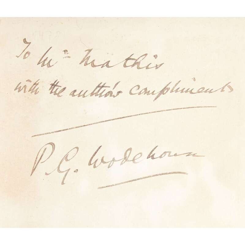 New York: W.J. Watt & Company, (1910). First edition, first issue. 8vo. (vi), 314 pp. Inscribed by Wodehouse on front free endpaper: "To Mr. Mathis/with the author's compliments/P.G. Wodehouse." Illustrated with frontispiece and four plates. Original pictorial black cloth-covered boards, slightly cocked, small abrasion at bottom of rear board, spine and extremities very lightly faded, stamped in gilt, in blind, olive-green, yellow, and with round illustrated paper onlay on front board; all edges trimmed; very light toning and spotting to endpapers. McIlvaine A13a.
