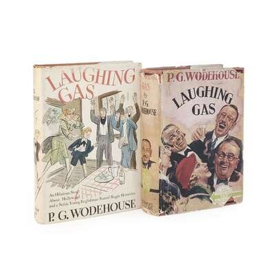 London: Herbert Jenkins Limited, 1936. 8vo. 311 pp. First edition. Original orange cloth-covered boards, stamped in black, head of spine lightly toned, spine slightly cocked; occasional foxing to gutters around the sewing, one short closed tear to bottom edge of p. 33/34; in the original pictorial dust jacket with 7s6d price to spine panel, moderately toned, wear and chipping to extremities, small loss to top of spine panel, top of front panel affecting the "E" in "Wodehouse" and bottom edge of front panel, old cellotape repair to verso. McIlvaine A56a. Together with: Laughing Gas Garden City: Doubleday, Doran & Company, Inc., 1936. 8vo. First American edition. Original orange cloth-covered boards, stamped in black, gift inscription to front paste-down, previous owner's bookplate to same and to front free endpaper; in the original dust jacket with some soiling and wear to extremities, spine slightly faded. McIlvaine A56b.