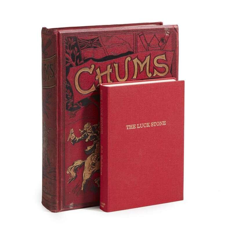 Chums, An Illustrated Paper for Boys London, etc: Cassell and Company, Limited, September 16, 1908-September 8, 1909. Vol. XVII, no's. 836-887. 4to. iv, 1044, (4) pp. Featuring the complete serialization of "The Luck Stone," written by Wodehouse under the pseudonym Basil Windham. Illustrated with color frontispiece and nine plates. Original pictorial red cloth-covered boards, scattered soiling, spine slightly faded, stamped in gilt and in black; all edges trimmed; title-page and index moderately worn and creased, text lightly toned, closed tear at fore edge of pp. 983/984, rear hinge reinforced, McIlvaine D80.1-18. Together with: The Luck Stone (London): Galahad Books, 1997. First and limited edition, #122 of 250 copies. Original red cloth-covered boards, stamped in gilt; all edges trimmed. Not in McIlvaine.