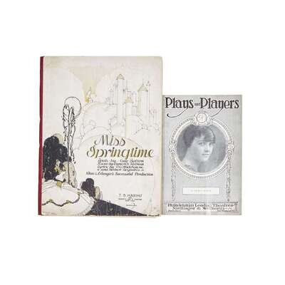 New York, (1916). 4to. (2), 109 pp. Vocal score. Stiff illustrated wrappers, fragile. In a green fall-down-back box. Together with an issue of Philadelphia theatre magazine, Plays and Players, with an ad for the opening of Little Miss Springtime at the Forrest Theatre in Philadelphia on September 11,1916. The play, now shortened to Miss Springtime, would open in New York two weeks later at the New Amsterdam Theatre and run for 227 performances.