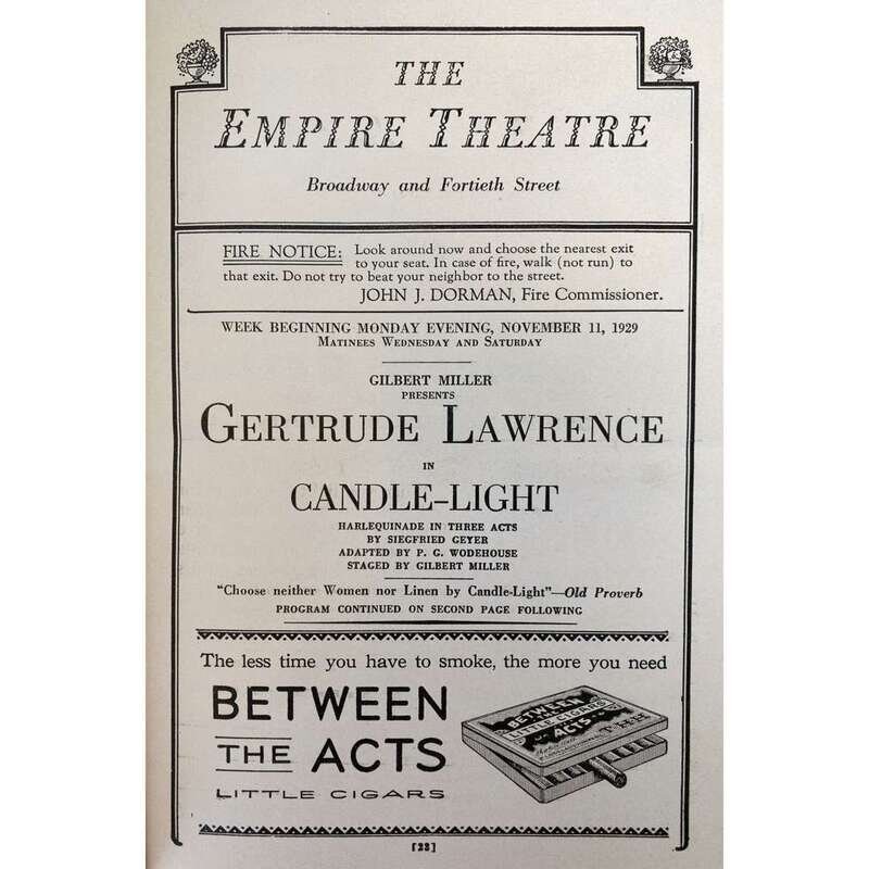 Garden City, New York: Doubleday & Company, Inc., 1946. Later printing. 8vo. viii, 696 pp. Inscribed by Wodehouse to English actress Gertrude Lawrence on front free endpaper: "To my beloved/Gertie/from Plummie/P.G. Wodehouse/Christmas 1946." Red cloth-covered boards, stamped in black; all edges trimmed; ownership signature in pencil on recto of rear free endpaper; lacking dust-jacket. McIlvaine B2a4. Together with: [Geyer, Siegfried] Wodehouse, P.G. (adaptation) Candle-Light New York, November 11, 1929. Program from the first production, at The Empire Theatre, starring Gertrude Lawrence, which opened on September 30 and ran for 128 performances.