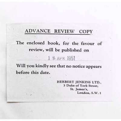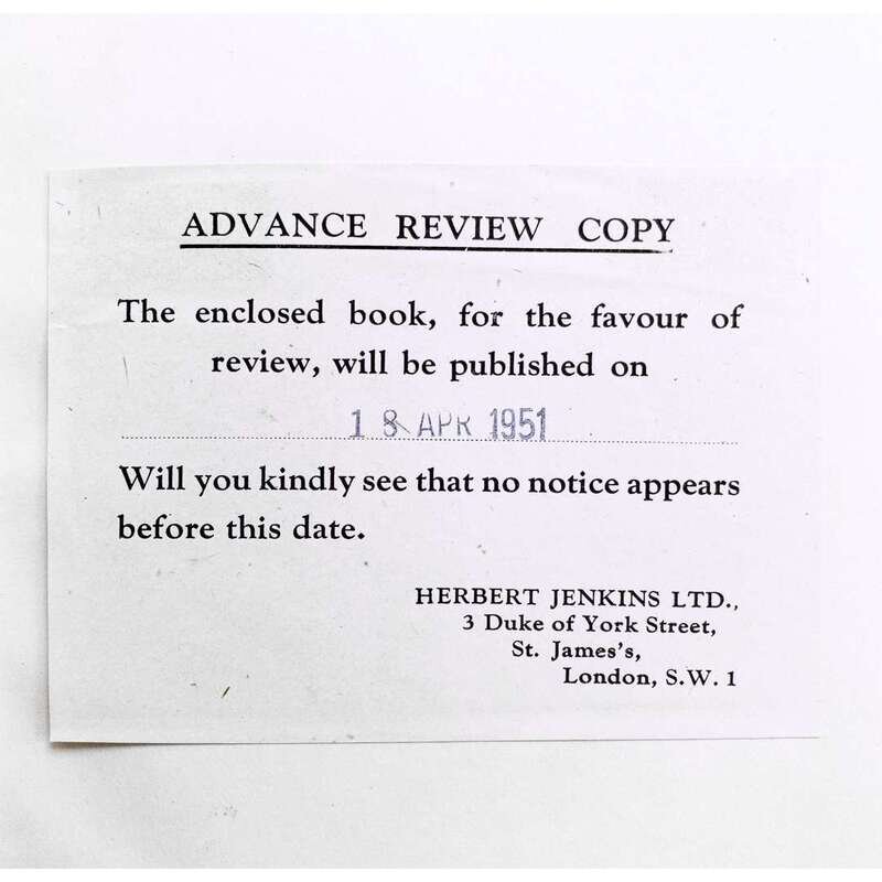 London: Herbert Jenkins, (1951). Advance review copy, with publisher's slip tipped in on first free endpaper. 8vo. 233, (1), (2) (ads) pp. Original orange cloth-covered boards, stamped in black; all edges trimmed; book-plate of Douglas R. Vining on front paste-down; in original price-clipped dust-jacket, tape repairs to verso, moderate edge wear, 2 1/2 in. closed tear along rear flap. McIlvaine A71a.