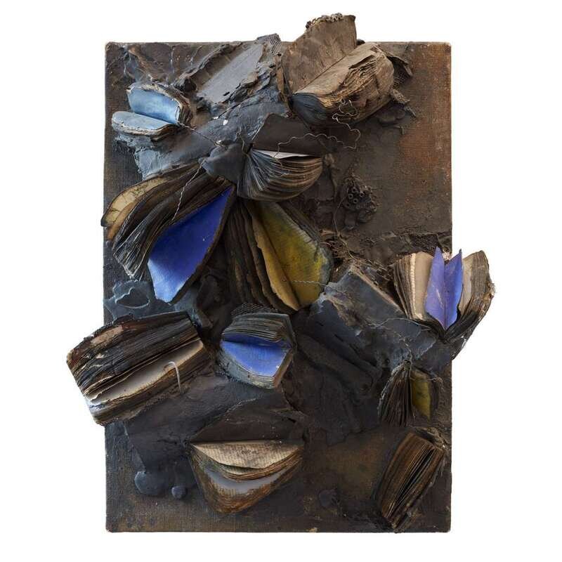 Mixed media collage, including books, wire and paint on canvas mounted on panel.