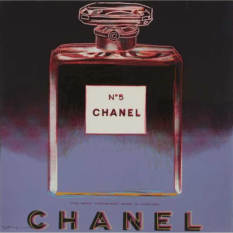 Chanel is one of ten images from Andy Warhol’s Ads series, each of which were appropriated from ubiquitous ads or logos of the 1950s-1980s. Other images in this series include advertisements for Van Heusen (featuring Ronald Reagan), Lifesavers candy, Volkswagen Beetle and logos for Apple computers and Paramount. At the beginning of his artistic career, when ‘serious’ artists used paint and were expected to avoid mention of money, Warhol embraced screenprinting, the slick medium of mass production and the intoxicating allure of commerce and consumption as his subject. Here, the brand name and bottle are highlighted in day-glo pink and yellow, and the background is a dramatic black, showcasing brand over the perfume itself, which the artist has cheekily left out of this composition altogether.