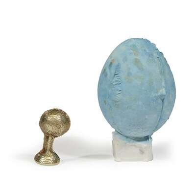 Birds, eggs and yolks figure prominently in Kiki Smith’s work, including in other multiples she created out of glass and plaster, connecting to notions of life and death and reproduction in her work over the course of her career. Smith was one of the first artists invited to a residency at Art Foundry Editions and created a project that encompasses elements of an edition and a unique work. The robin’s egg blue forms were hand-painted in watercolor on plaster by the artist, and the gold and silver yolks are also uniquely cast. Here the yolk stands on its own as the precious, vulnerable center, detached from its protective envelope and singled out as something unique.