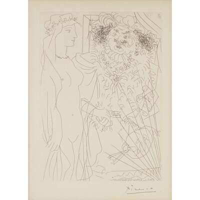 Pablo Picasso (Spanish, 1881-1973) Rembrandt et Femme au Voile, Plate 36 from La Suite Vollard