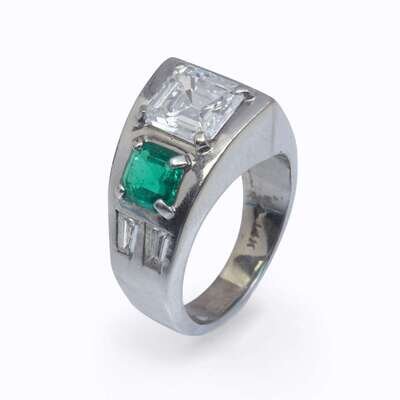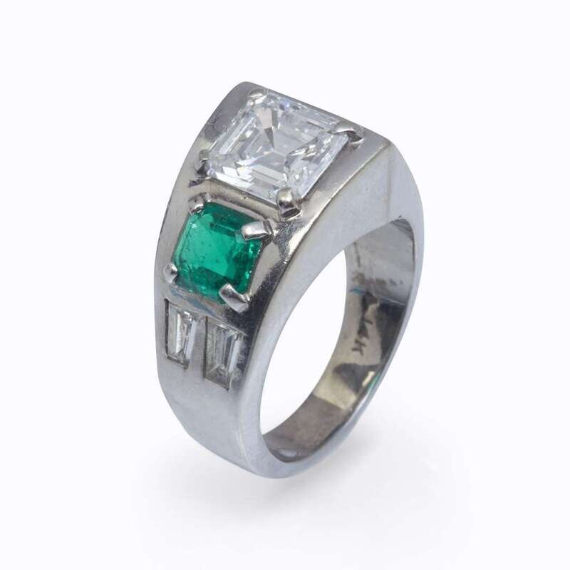 geometric design set with an emerald-cut diamond weighing approximately 1.90 carats, further set with an emerald-cut emerald and two bezel-set tapering baguette-cut diamonds.