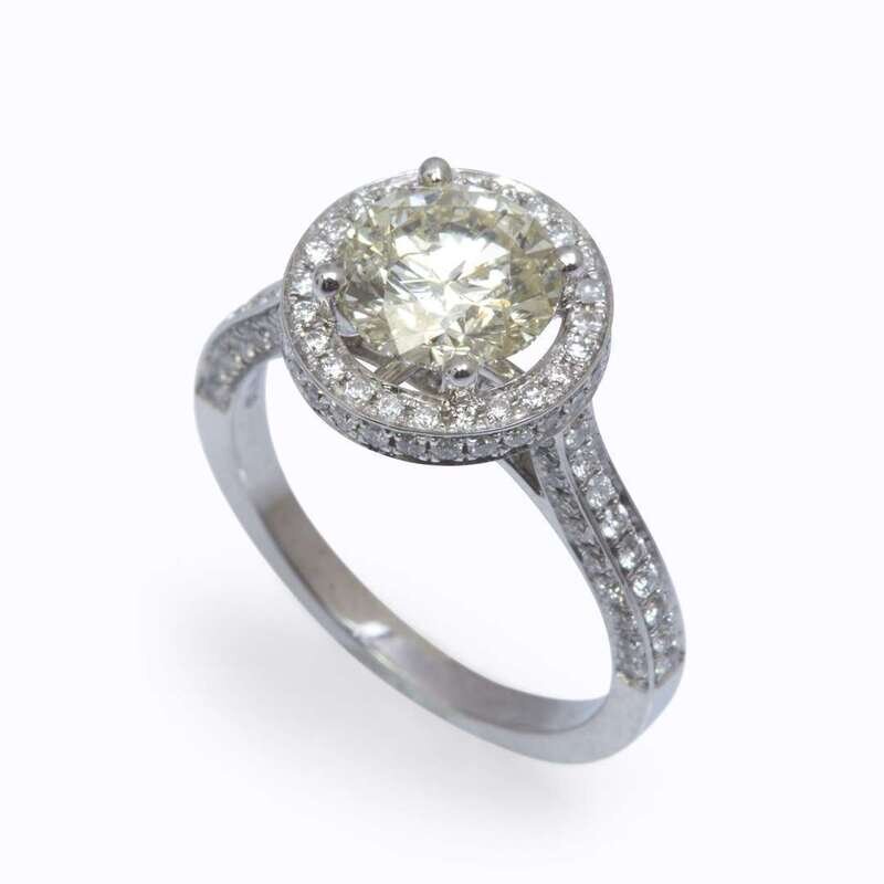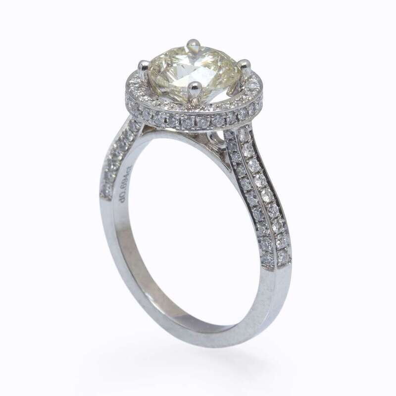 centering a round brilliant-cut colored diamond (diamond not tested for natural color) weighing approximately 2.00 carats, accented by round brilliant and pear-shaped diamonds; estimated total remaining diamond weight: 0.65 carat.