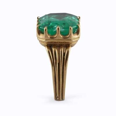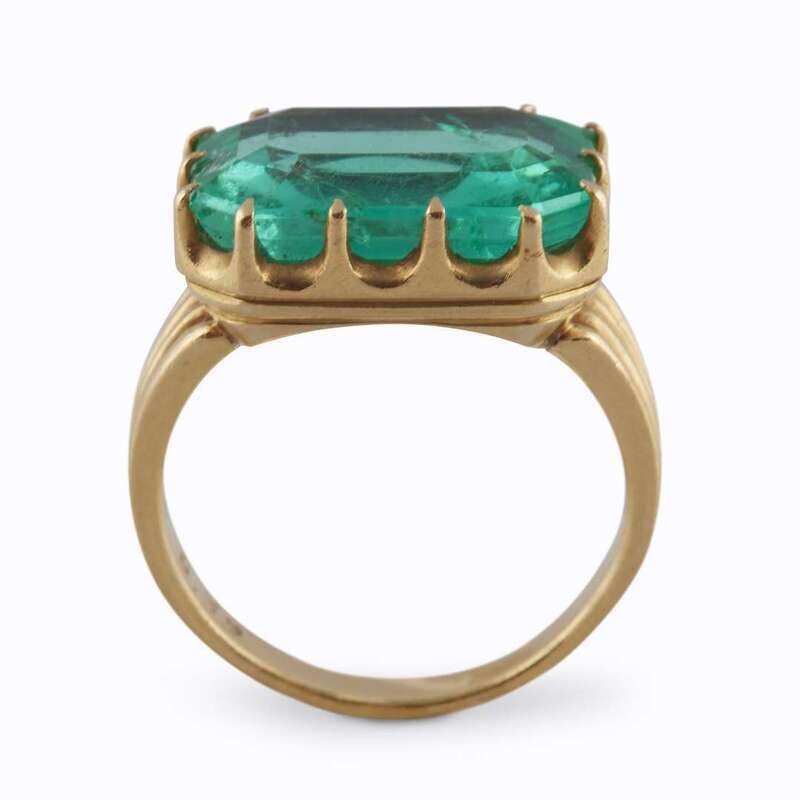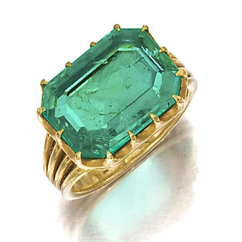 designed as an emerald-cut emerald weighing 8.39 carats, claw-set between wide fluted shoulders.