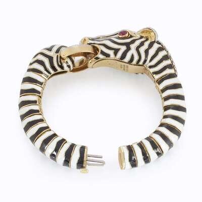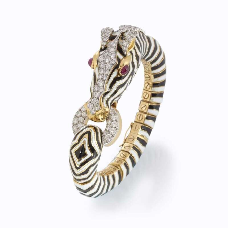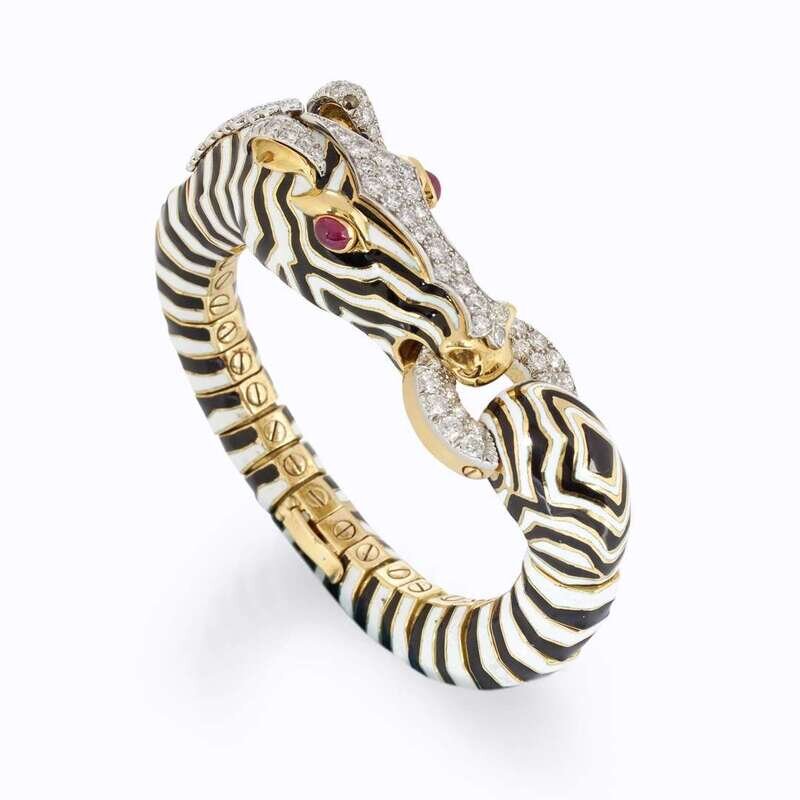 designed as a zebra; the head with circular-cut diamond set platinum mane, muzzle, and ears, oval cabochon ruby eyes, and open mouth holding a diamond pavé ring joined by an articulated body; estimated total diamond weight: 3.75 carats.