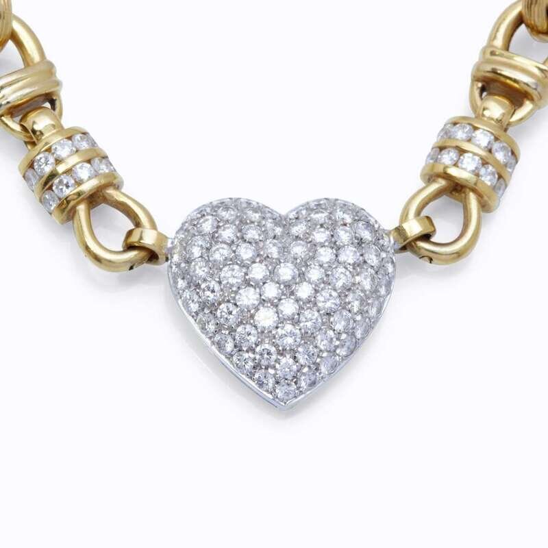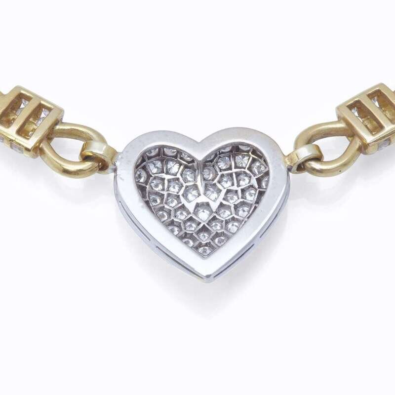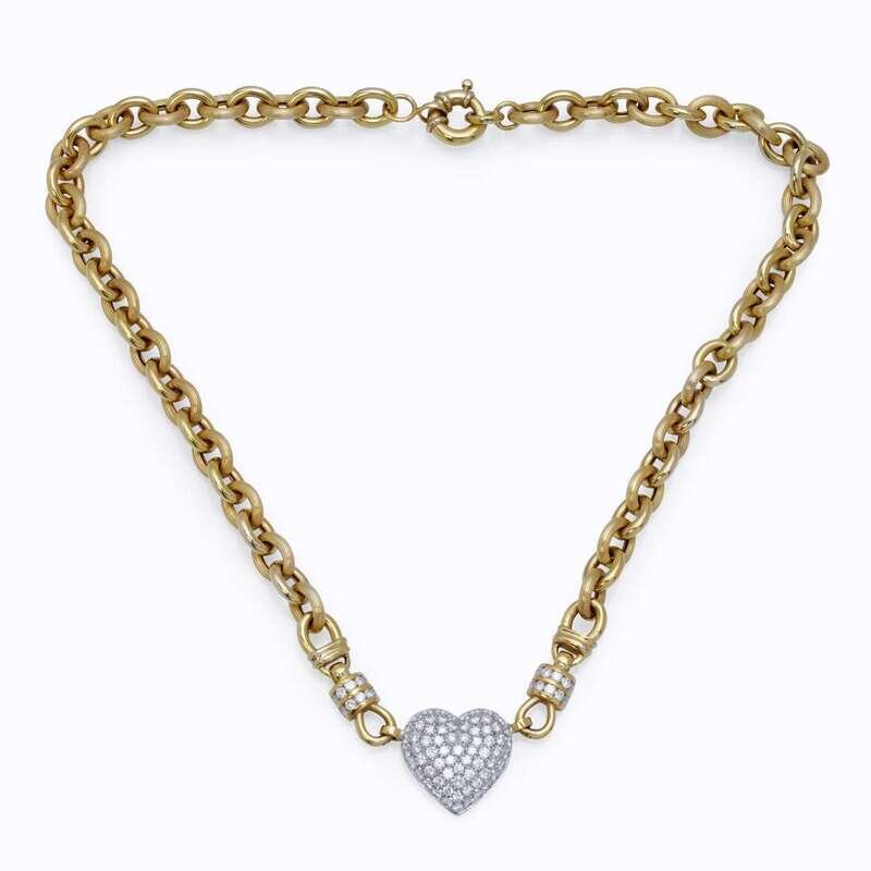 designed as a round brilliant-cut diamond pavé-set platinum heart pendant on polished and fluted gold cable link chain; estimated total diamond weight: 3.75 carats.