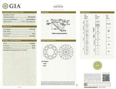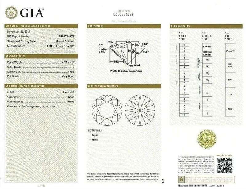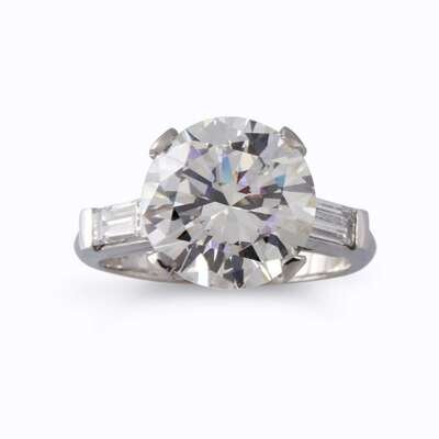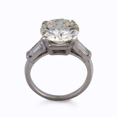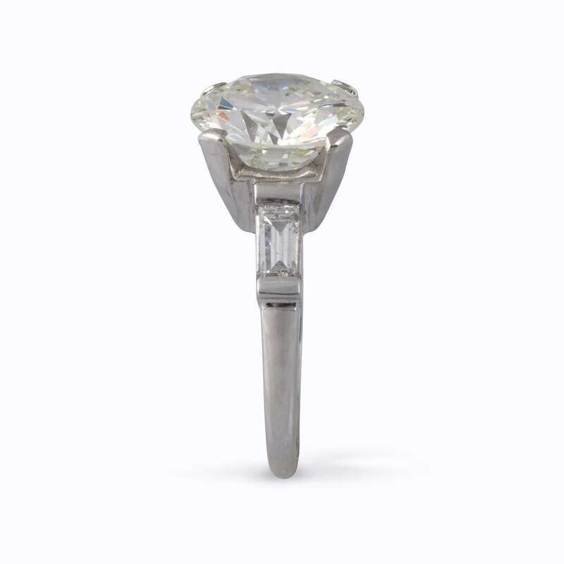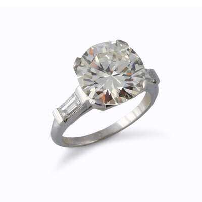 centering a round brilliant-cut diamond weighing 4.96 carats, flanked by tapering baguettes, mounted in platinum.