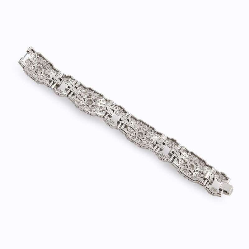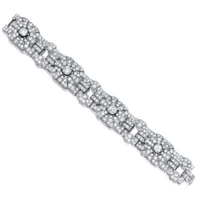 designed as panels centered by four bezel-set old European-cut diamonds; estimated total diamond weight 4.10 carats, surrounded by circular-cut diamonds; estimated total remaining diamond weight: 25.00 carats, within an open work setting, joined by rectangular shaped links.