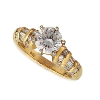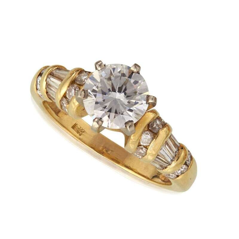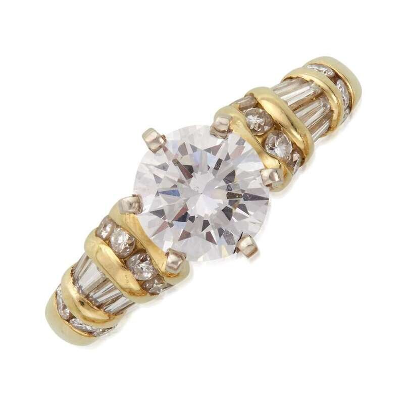 centering a round brilliant-cut diamond weighing 1.67 carats, flanked by alternating rows of round brilliant and baguette-cut diamonds; estimated total remaining diamond weight: 0.35 carat, mounted in eighteen karat gold.