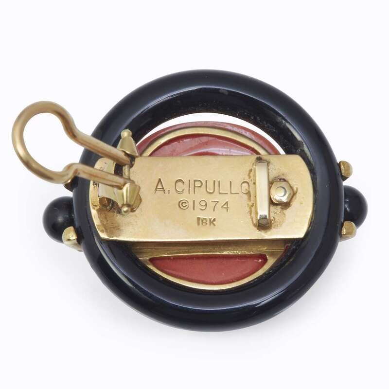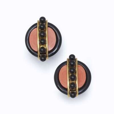 A pair of onyx, coral, and eighteen karat gold ear clips, Aldo Cipullo 1974