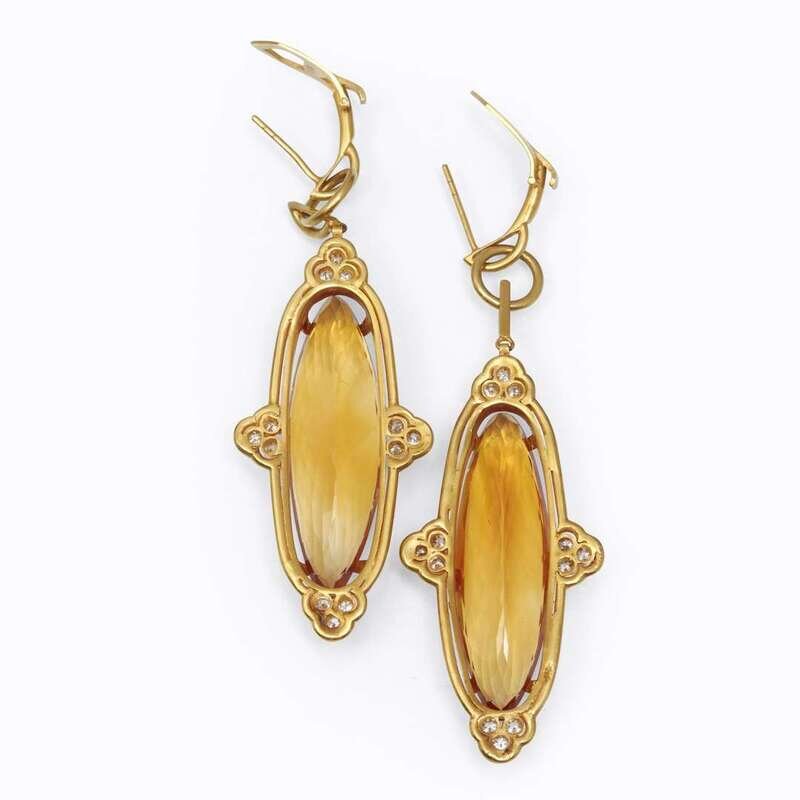 suspending elongated oval-cut citrines, accented by round brilliant-cut diamonds, mounted in eighteen karat brushed gold; estimated total diamond weight: 0.95 carat.