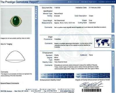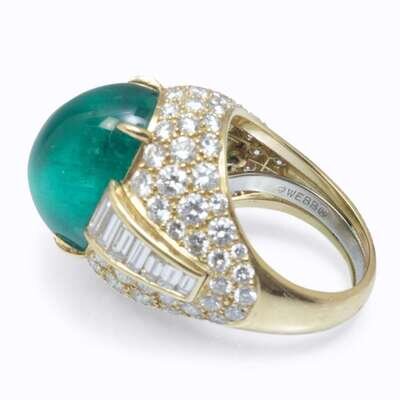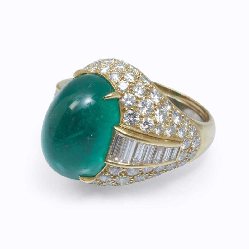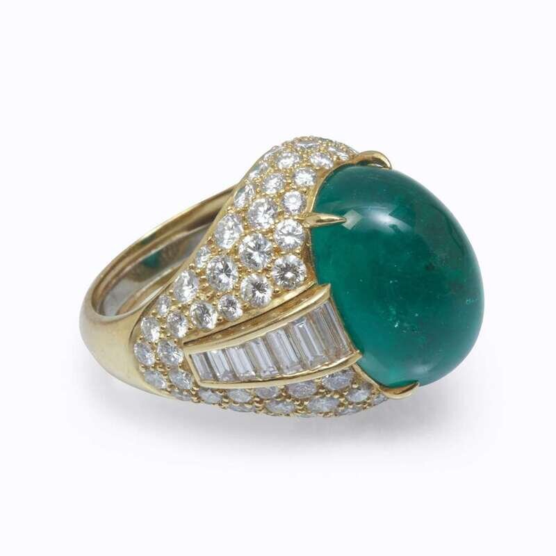 bombé design centering an oval cabochon emerald measuring approximately 18.3mm x 12.8mm x 10.51mm, accented by baguette and round brilliant-cut diamonds; estimated total diamond weight: 5.50 carats.