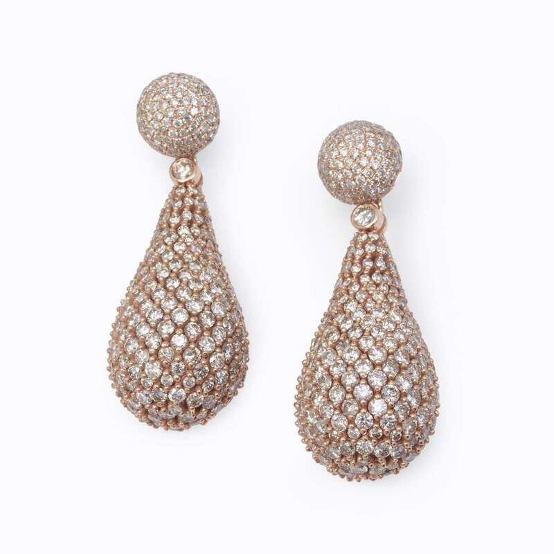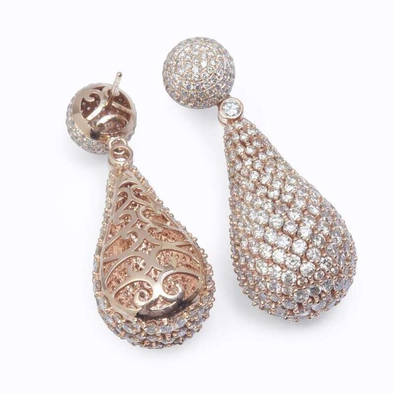 drop earrings with pavé-set round brilliant-cut diamonds; estimated total diamond weight: 12.15 carats.