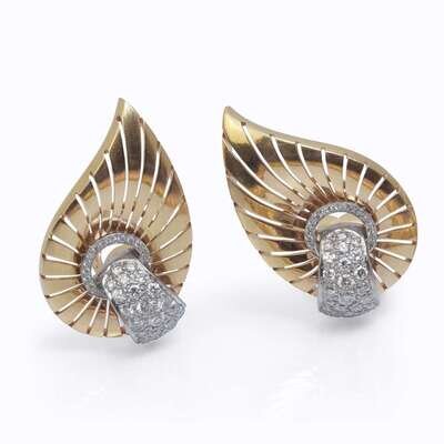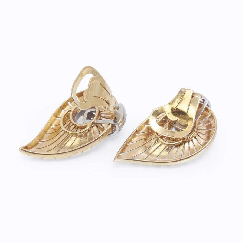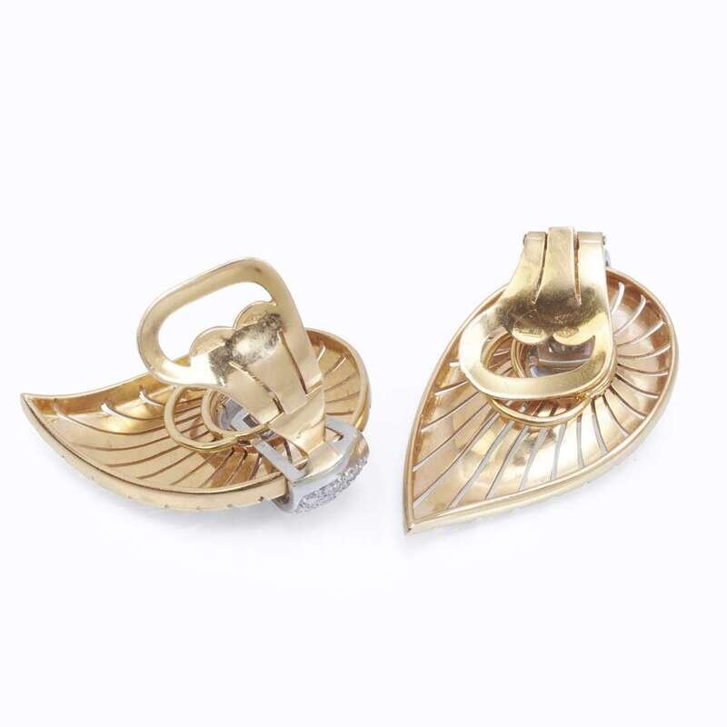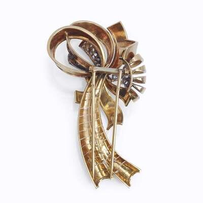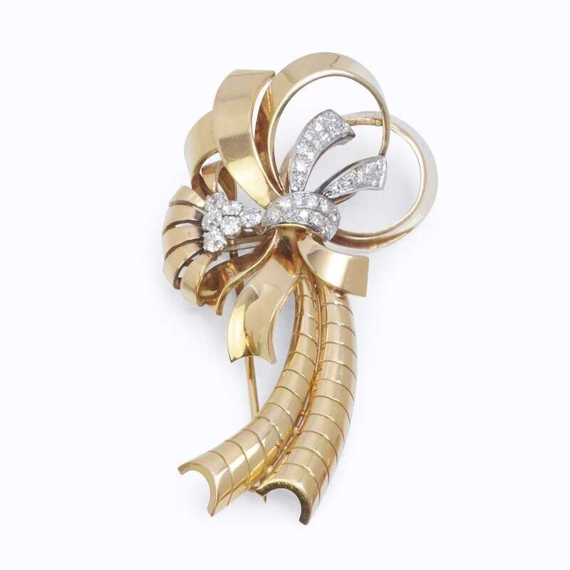 the spray brooch designed as curling ribbons joined by a single or old mine-cut diamond knot, together with pierced foliate clips accented by circular-cut diamond pavé straps; estimated total diamond weight: 4.40 carats.