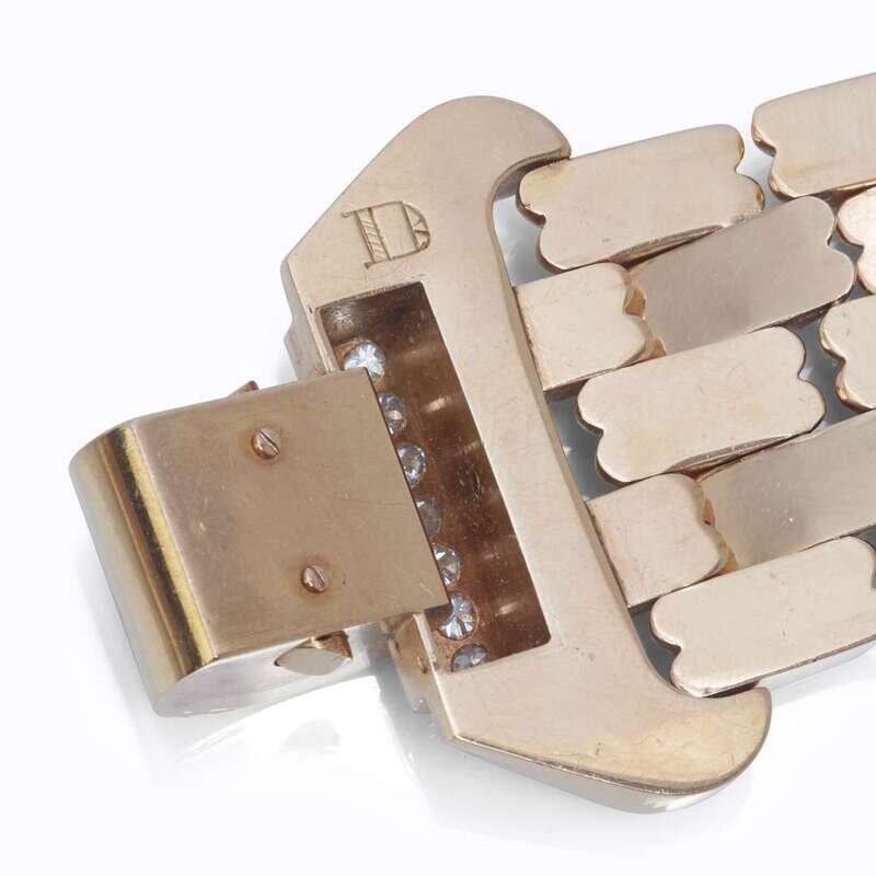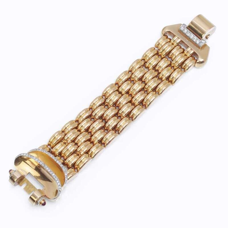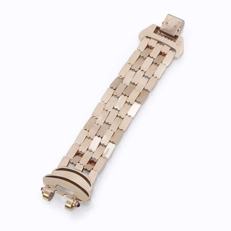 A Retro eighteen karat rose gold, diamond, and ruby strap bracelet France