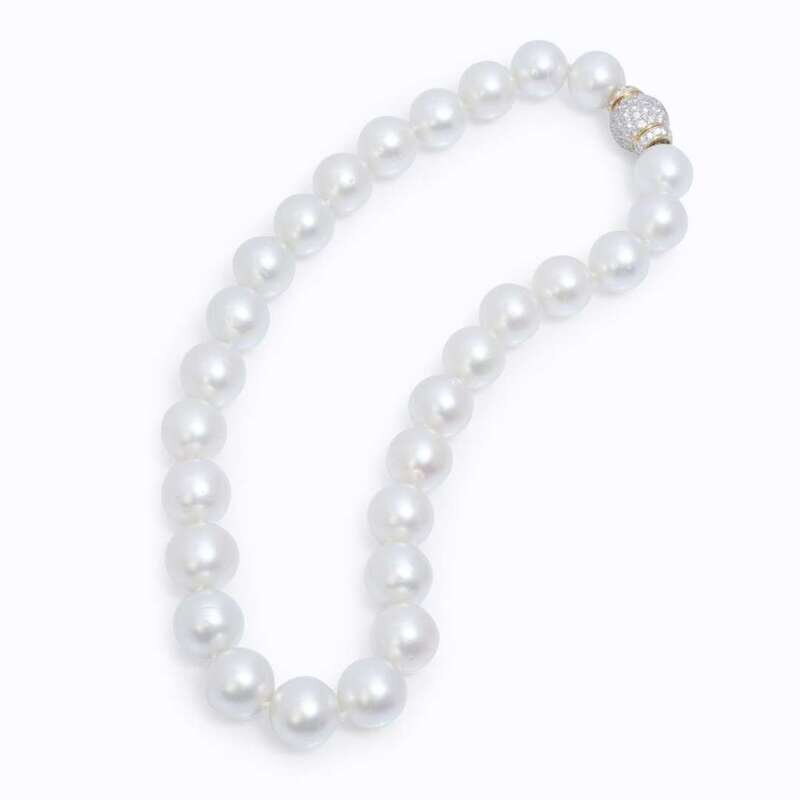 comprised of twenty-eight South Sea cultured pearls measuring approximately 14.0mm to 13.0mm in diameter, completed by a round brilliant-cut diamond and eighteen karat gold clasp; estimated total diamond weight: 3.50 carats.