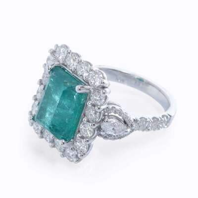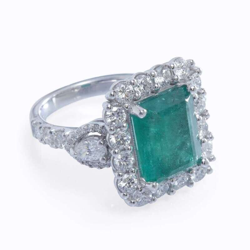 An emerald, diamond, and eighteen karat white gold ring