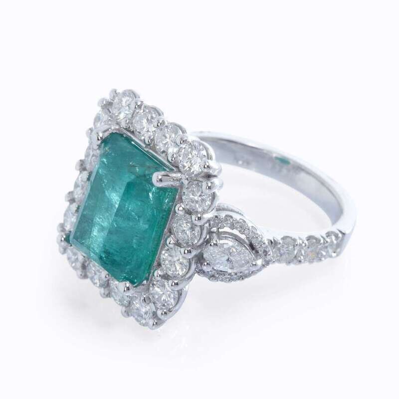 centering an emerald-cut emerald measuring approximately 12.0mm x 9.7mm x 6.5mm, framed by round brilliant-cut diamonds, between marquise and round brilliant-cut diamond open shoulders; estimated total diamond weight: 2.50 carats.