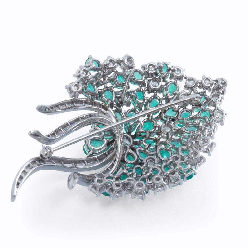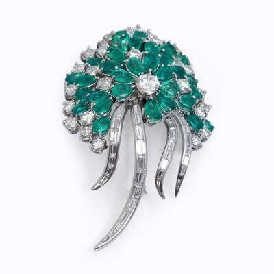 floral form set with pear-shaped emeralds, accented throughout with round brilliant-cut and baguette-cut diamond tendrils; estimated total diamond weight: 6.00 carats.